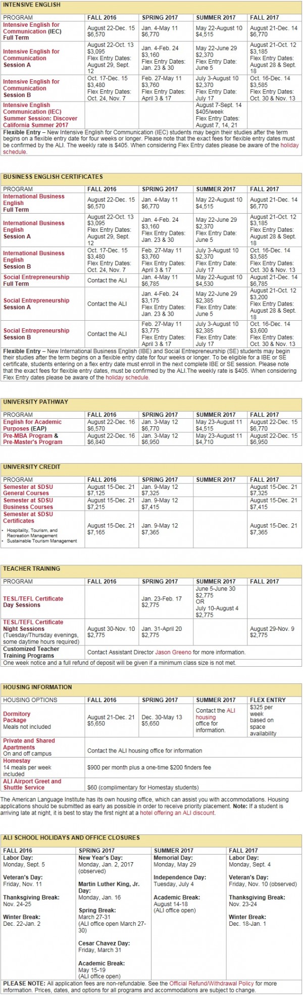 •ALI는 세계 각지에서 온 강사들에게 최신 ESL/EFL 강의 기법/방법을 교육하는 유명한 강사 교육 센터 •ALI 강의는 최신 강의 방법을 교육받고 국가에서 인정하는 고학력의 강사가 가르치고 있습니다. •ALI는 미국 내 대학교와 전문대학교가 운영하는 집중 영어 프로그램 컨소시엄인 UCIEP의 유일한 샌디에이고 지역 회원입니다. 또한, ALI는 AAIEP 및 NAFSA의 회원이기도 합니다. •ALI의 대학 진학 상담 서비스(University Advising Services)는 SDSU 경영대학원을 비롯하여 미국 전역의 학위 프로그램에 입학할 수 있도록 학생들을 지원하는 데 우수한 실적을 보유하고 있습니다. 모든 ALI 학생에게 전담 학사 상담을 무료로 제공합니다. •고급 ALI 학생은 정규 SDSU 강의를 수강하여 샌디에이고 주립 대학교 입학 절차를 거치지 않고 학점을 받을 수 있습니다. •SDSU 프로그램의 학기제를 통해 ALI는 미국 학생과 함께 정규 SDSU 강의로 구성되고 공식 학점과 성적 증명서가 포함된 자격 프로그램을 제공합니다. •모든 ALI 강의는 SDSU 캠퍼스의 게이트웨이 센터(Gateway Center)와 평생교육센터(Extended Studies Center)에서 가르치고 있습니다. 모든 ALI 학생은 게이트웨이 센터(Gateway Center)와 SDSU 본관 도서관에서 고속 컴퓨터와 언어실습실을 이용할 수 있습니다. •ALI는 연중 내내 캠퍼스 내 숙소(기숙사 및 아파트)를 제공합니다. •또한, SDSU에서 샌디에이고 트롤리를 비롯하여 대도시인 샌디에이고 대중교통을 편리하게 이용할 수 있어, ALI 학생은 샌디에이고 지역의 주요 지점을 빠르게 이동할 수 있습니다.