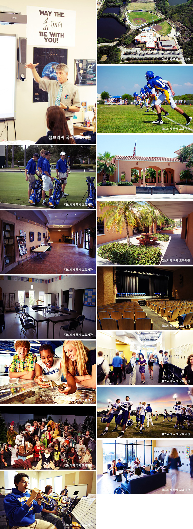 Canterbury School of Florida는 플로리다 주에서 4번째로 큰 St. Petersburg에 위치하고 있습니다. 학업프로그램으로는 25개의 AP 과목, 43개의 Honors 과목을 제공합니다. 정규 과목 외에도 다양한 코스를 제공합니다. Marine Studies 코스는 Cousteau Center는 Canterbury에 2,800 평방 피트의 최첨단 해양 학문 시설을 갖추고 있습니다. 이 센터의 실습실에는 교실, 연구 공간, 터치 탱크, 틸라피아 탱크, 컴퓨터실 및 전자 칠판이 구비되어 있습니다. 카약, 23피트 배를 포함하여 게, 불가사리 등 해양 동물이 가득한 3개의 수족관은 지역 해양 환경에대해 공부할 수 있으며, 이를 통해 학생들은 다양한 생물을 조사할 수 있습니다. 1월 첫째주에는 Bahamas, Florida Keys, Washington D.C 여행 및 미국 내 여러 대학들을 탐방하는 기회를 갖습니다. 그리고 영화, 요리, 목공, 사진, 로봇공학 등을 공부할 수 수업이 포함되어있습니다. Canterbury Advisory Program은 향후 4년동안 도움 및 가이드를 해 줄 어드바이저와 학생을 연결해줍니다. 학생들은 그들의 어드바이저와 그룹단위 또는 개별적인 미팅을 정기적으로 가질 수 있습니다. 국제학생을 위한 국제학생 학업 지원 프로그램을 제공합니다. 추가적으로 학점 인정이 되는 영어 보조수업으로 소규모로 수업이 운영되며 일주일에 5회 제공됩니다. Canterbury는 학생들의 SAT와 ACT 준비에 추가적인 도움을 제공하기 위해 여러 현지 튜터링 회사와 파트너십을 갖고 있습니다. 또한 각 학년별로 대학 진학 상담을 제공합니다. 특별 활동으로 30개의 클럽, 특별 활동이 있으며, 12개의 스포츠 활동 등 다양한 활동에 참여할 수 있습니다. SAT 평균점수는 1660점, 상위 30%는 1903점, 상위 10%는 2085점 입니다. 졸업생이 진학한 대학은 다음과 같습니다. Columbia University, Dartmouth College, California Institute of Technology, Washington University in St. Louis, Brown University, Cornell University, Vanderbilt University, Emory University, Wake Forest University, University of California – Los Angeles, University of North Carolina – Chapel Hill, Boston College. |